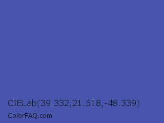 CIELab 39.332,21.518,-48.339 Color is a normal blue color and the nearest color is Liberty #545aa7. Hex code #4855ac and RGB value is rgb(72,85,172). In RGB color space, this color is composed of 28% red, 33% green, 67% blue, In CMYK color space, this color is composed of 58% cyan, 51% magenta, 0% yellow , 33% black , In HSL color space, this color has a hue angle of 232° , 41% saturation and 48% lightness.