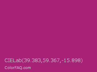 CIELab 39.383,59.367,-15.898 Color is a normal magenta color and the nearest color is Royal Heath #ab3472. Hex code #a82378 and RGB value is rgb(168,35,120). In RGB color space, this color is composed of 66% red, 14% green, 47% blue, In CMYK color space, this color is composed of 0% cyan, 79% magenta, 29% yellow , 34% black , In HSL color space, this color has a hue angle of 322° , 66% saturation and 40% lightness.