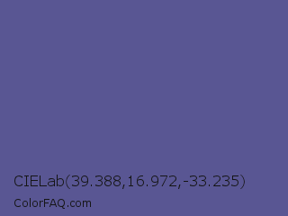 CIELab 39.388,16.972,-33.235 Color is a normal indigo color and the nearest color is Butterfly Bush #624e9a. Hex code #595693 and RGB value is rgb(89,86,147). In RGB color space, this color is composed of 35% red, 34% green, 58% blue, In CMYK color space, this color is composed of 39% cyan, 41% magenta, 0% yellow , 42% black , In HSL color space, this color has a hue angle of 243° , 26% saturation and 46% lightness.