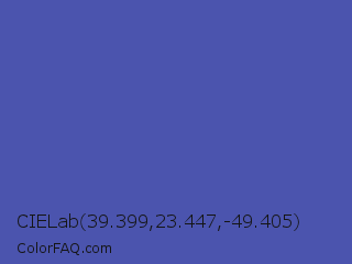 CIELab 39.399,23.447,-49.405 Color is a normal blue color and the nearest color is Liberty #545aa7. Hex code #4b54ae and RGB value is rgb(75,84,174). In RGB color space, this color is composed of 29% red, 33% green, 68% blue, In CMYK color space, this color is composed of 57% cyan, 52% magenta, 0% yellow , 32% black , In HSL color space, this color has a hue angle of 235° , 40% saturation and 49% lightness.
