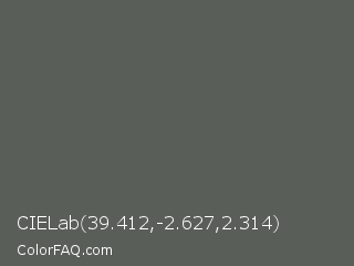CIELab 39.412,-2.627,2.314 Color is a normal green color and the nearest color is Chicago #5d5c58. Hex code #5a5e59 and RGB value is rgb(90,94,89). In RGB color space, this color is composed of 35% red, 37% green, 35% blue, In CMYK color space, this color is composed of 4% cyan, 0% magenta, 5% yellow , 63% black , In HSL color space, this color has a hue angle of 108° , 3% saturation and 36% lightness.