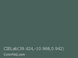 CIELab 39.424,-10.968,0.942 Color is a normal green color and the nearest color is Feldgrau #4d5d53. Hex code #49625b and RGB value is rgb(73,98,91). In RGB color space, this color is composed of 29% red, 38% green, 36% blue, In CMYK color space, this color is composed of 26% cyan, 0% magenta, 7% yellow , 62% black , In HSL color space, this color has a hue angle of 163° , 15% saturation and 34% lightness.