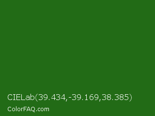 CIELab 39.434,-39.169,38.385 Color is a dark green color and the nearest color is Bilbao #327c14. Hex code #226b16 and RGB value is rgb(34,107,22). In RGB color space, this color is composed of 13% red, 42% green, 9% blue, In CMYK color space, this color is composed of 68% cyan, 0% magenta, 79% yellow , 58% black , In HSL color space, this color has a hue angle of 112° , 66% saturation and 25% lightness.