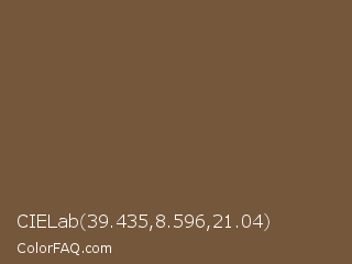CIELab 39.435,8.596,21.04 Color is a normal orange color and the nearest color is Tuscan Brown Coffee #6f4e37. Hex code #75573b and RGB value is rgb(117,87,59). In RGB color space, this color is composed of 46% red, 34% green, 23% blue, In CMYK color space, this color is composed of 0% cyan, 26% magenta, 50% yellow , 54% black , In HSL color space, this color has a hue angle of 29° , 33% saturation and 35% lightness.