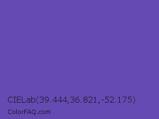 CIELab 39.444,36.821,-52.175 Color is a normal indigo color and the nearest color is Studio #714ab2. Hex code #654ab3 and RGB value is rgb(101,74,179). In RGB color space, this color is composed of 40% red, 29% green, 70% blue, In CMYK color space, this color is composed of 44% cyan, 59% magenta, 0% yellow , 30% black , In HSL color space, this color has a hue angle of 255° , 42% saturation and 50% lightness.
