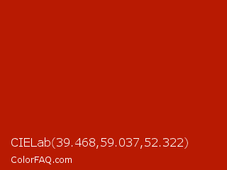 CIELab 39.468,59.037,52.322 Color is a normal red color and the nearest color is Milano Red #b81104. Hex code #b81a02 and RGB value is rgb(184,26,2). In RGB color space, this color is composed of 72% red, 10% green, 1% blue, In CMYK color space, this color is composed of 0% cyan, 86% magenta, 99% yellow , 28% black , In HSL color space, this color has a hue angle of 8° , 98% saturation and 36% lightness.