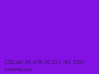CIELab 39.478,76.211,-81.539 Color is a normal purple color and the nearest color is French Violet #8806ce. Hex code #8311e6 and RGB value is rgb(131,17,230). In RGB color space, this color is composed of 51% red, 7% green, 90% blue, In CMYK color space, this color is composed of 43% cyan, 93% magenta, 0% yellow , 10% black , In HSL color space, this color has a hue angle of 272° , 86% saturation and 48% lightness.