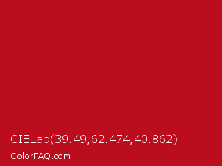 CIELab 39.49,62.474,40.862 Color is a normal red color and the nearest color is Monza #c7031e. Hex code #bb0d1e and RGB value is rgb(187,13,30). In RGB color space, this color is composed of 73% red, 5% green, 12% blue, In CMYK color space, this color is composed of 0% cyan, 93% magenta, 84% yellow , 27% black , In HSL color space, this color has a hue angle of 354° , 87% saturation and 39% lightness.