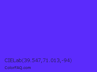 CIELab 39.547,71.013,-94 Color is a normal indigo color and the nearest color is Han Purple #5218fa. Hex code #5b2bfc and RGB value is rgb(91,43,252). In RGB color space, this color is composed of 36% red, 17% green, 99% blue, In CMYK color space, this color is composed of 64% cyan, 83% magenta, 0% yellow , 1% black , In HSL color space, this color has a hue angle of 254° , 97% saturation and 58% lightness.