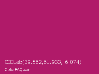 CIELab 39.562,61.933,-6.074 Color is a normal rose color and the nearest color is Jazzberry Jam #a50b5e. Hex code #b01a69 and RGB value is rgb(176,26,105). In RGB color space, this color is composed of 69% red, 10% green, 41% blue, In CMYK color space, this color is composed of 0% cyan, 85% magenta, 40% yellow , 31% black , In HSL color space, this color has a hue angle of 328° , 74% saturation and 40% lightness.