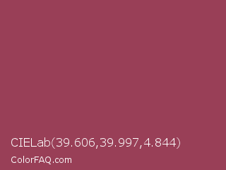 CIELab 39.606,39.997,4.844 Color is a normal rose color and the nearest color is Vin Rouge #983d61. Hex code #993f57 and RGB value is rgb(153,63,87). In RGB color space, this color is composed of 60% red, 25% green, 34% blue, In CMYK color space, this color is composed of 0% cyan, 59% magenta, 43% yellow , 40% black , In HSL color space, this color has a hue angle of 344° , 42% saturation and 42% lightness.