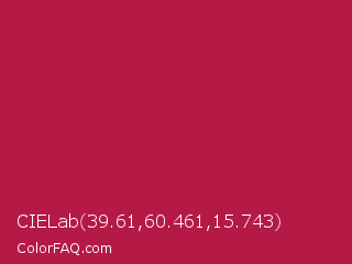 CIELab 39.61,60.461,15.743 Color is a normal rose color and the nearest color is French Wine #ac1e44. Hex code #b51a47 and RGB value is rgb(181,26,71). In RGB color space, this color is composed of 71% red, 10% green, 28% blue, In CMYK color space, this color is composed of 0% cyan, 86% magenta, 61% yellow , 29% black , In HSL color space, this color has a hue angle of 343° , 75% saturation and 41% lightness.