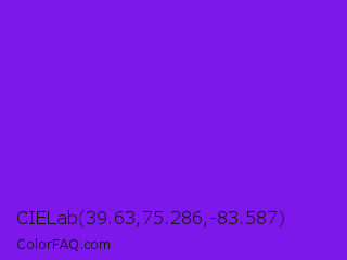 CIELab 39.63,75.286,-83.587 Color is a normal violet color and the nearest color is Blue Violet #8a2be2. Hex code #7e18ea and RGB value is rgb(126,24,234). In RGB color space, this color is composed of 49% red, 9% green, 92% blue, In CMYK color space, this color is composed of 46% cyan, 90% magenta, 0% yellow , 8% black , In HSL color space, this color has a hue angle of 269° , 83% saturation and 51% lightness.