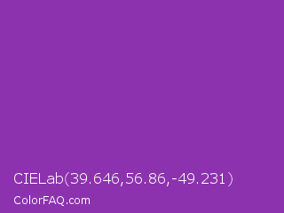 CIELab 39.646,56.86,-49.231 Color is a normal purple color and the nearest color is Purpureus #9a4eae. Hex code #8d32af and RGB value is rgb(141,50,175). In RGB color space, this color is composed of 55% red, 20% green, 69% blue, In CMYK color space, this color is composed of 19% cyan, 71% magenta, 0% yellow , 31% black , In HSL color space, this color has a hue angle of 284° , 56% saturation and 44% lightness.