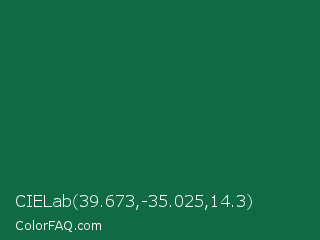 CIELab 39.673,-35.025,14.3 Color is a dark green color and the nearest color is Jewel #126b40. Hex code #106b45 and RGB value is rgb(16,107,69). In RGB color space, this color is composed of 6% red, 42% green, 27% blue, In CMYK color space, this color is composed of 85% cyan, 0% magenta, 36% yellow , 58% black , In HSL color space, this color has a hue angle of 155° , 74% saturation and 24% lightness.