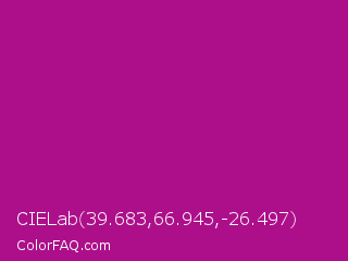 CIELab 39.683,66.945,-26.497 Color is a normal magenta color and the nearest color is Violet Eggplant #991199. Hex code #ad0f8a and RGB value is rgb(173,15,138). In RGB color space, this color is composed of 68% red, 6% green, 54% blue, In CMYK color space, this color is composed of 0% cyan, 91% magenta, 20% yellow , 32% black , In HSL color space, this color has a hue angle of 313° , 84% saturation and 37% lightness.