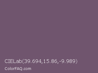 CIELab 39.694,15.86,-9.989 Color is a normal magenta color and the nearest color is Salt Box #685e6e. Hex code #70556e and RGB value is rgb(112,85,110). In RGB color space, this color is composed of 44% red, 33% green, 43% blue, In CMYK color space, this color is composed of 0% cyan, 24% magenta, 2% yellow , 56% black , In HSL color space, this color has a hue angle of 304° , 14% saturation and 39% lightness.