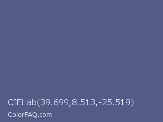 CIELab 39.699,8.513,-25.519 Color is a normal blue color and the nearest color is Purple Navy #4e5180. Hex code #535b87 and RGB value is rgb(83,91,135). In RGB color space, this color is composed of 33% red, 36% green, 53% blue, In CMYK color space, this color is composed of 39% cyan, 33% magenta, 0% yellow , 47% black , In HSL color space, this color has a hue angle of 231° , 24% saturation and 43% lightness.