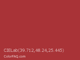 CIELab 39.712,48.24,25.445 Color is a normal red color and the nearest color is Sweet Brown #a83731. Hex code #a93337 and RGB value is rgb(169,51,55). In RGB color space, this color is composed of 66% red, 20% green, 22% blue, In CMYK color space, this color is composed of 0% cyan, 70% magenta, 67% yellow , 34% black , In HSL color space, this color has a hue angle of 358° , 54% saturation and 43% lightness.