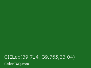 CIELab 39.714,-39.765,33.04 Color is a dark green color and the nearest color is La Salle Green #087830. Hex code #1b6c23 and RGB value is rgb(27,108,35). In RGB color space, this color is composed of 11% red, 42% green, 14% blue, In CMYK color space, this color is composed of 75% cyan, 0% magenta, 68% yellow , 58% black , In HSL color space, this color has a hue angle of 126° , 60% saturation and 26% lightness.