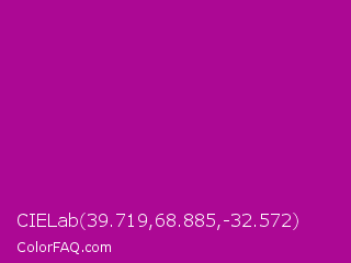 CIELab 39.719,68.885,-32.572 Color is a normal magenta color and the nearest color is Violet Eggplant #991199. Hex code #ac0894 and RGB value is rgb(172,8,148). In RGB color space, this color is composed of 67% red, 3% green, 58% blue, In CMYK color space, this color is composed of 0% cyan, 95% magenta, 14% yellow , 33% black , In HSL color space, this color has a hue angle of 309° , 91% saturation and 35% lightness.