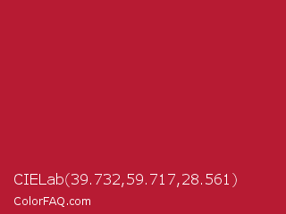CIELab 39.732,59.717,28.561 Color is a normal red color and the nearest color is Upsdell Red #ae2029. Hex code #b71b33 and RGB value is rgb(183,27,51). In RGB color space, this color is composed of 72% red, 11% green, 20% blue, In CMYK color space, this color is composed of 0% cyan, 85% magenta, 72% yellow , 28% black , In HSL color space, this color has a hue angle of 351° , 74% saturation and 41% lightness.