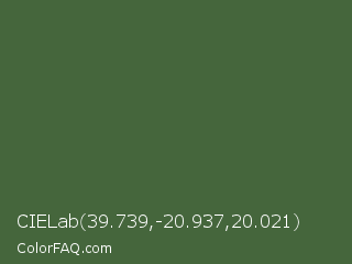 CIELab 39.739,-20.937,20.021 Color is a normal green color and the nearest color is Chalet Green #516e3d. Hex code #45663c and RGB value is rgb(69,102,60). In RGB color space, this color is composed of 27% red, 40% green, 24% blue, In CMYK color space, this color is composed of 32% cyan, 0% magenta, 41% yellow , 60% black , In HSL color space, this color has a hue angle of 107° , 26% saturation and 32% lightness.