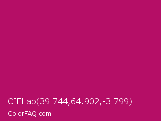 CIELab 39.744,64.902,-3.799 Color is a normal rose color and the nearest color is Lipstick #ab0563. Hex code #b50e66 and RGB value is rgb(181,14,102). In RGB color space, this color is composed of 71% red, 5% green, 40% blue, In CMYK color space, this color is composed of 0% cyan, 92% magenta, 44% yellow , 29% black , In HSL color space, this color has a hue angle of 328° , 86% saturation and 38% lightness.