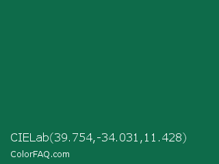 CIELab 39.754,-34.031,11.428 Color is a dark green color and the nearest color is Jewel #126b40. Hex code #0e6b4a and RGB value is rgb(14,107,74). In RGB color space, this color is composed of 5% red, 42% green, 29% blue, In CMYK color space, this color is composed of 87% cyan, 0% magenta, 31% yellow , 58% black , In HSL color space, this color has a hue angle of 159° , 77% saturation and 24% lightness.
