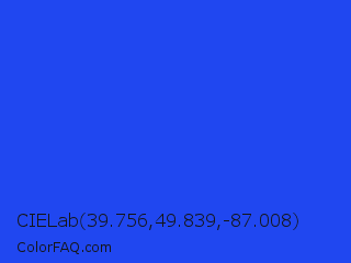 CIELab 39.756,49.839,-87.008 Color is a normal blue color and the nearest color is Palatinate Blue #273be2. Hex code #2047f0 and RGB value is rgb(32,71,240). In RGB color space, this color is composed of 13% red, 28% green, 94% blue, In CMYK color space, this color is composed of 87% cyan, 70% magenta, 0% yellow , 6% black , In HSL color space, this color has a hue angle of 229° , 87% saturation and 53% lightness.