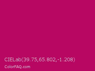 CIELab 39.75,65.802,-1.208 Color is a normal rose color and the nearest color is Lipstick #ab0563. Hex code #b70762 and RGB value is rgb(183,7,98). In RGB color space, this color is composed of 72% red, 3% green, 38% blue, In CMYK color space, this color is composed of 0% cyan, 96% magenta, 46% yellow , 28% black , In HSL color space, this color has a hue angle of 329° , 93% saturation and 37% lightness.