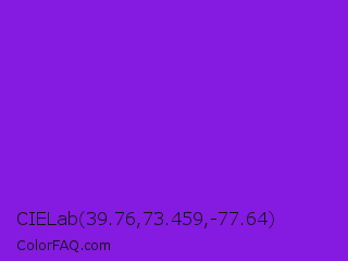 CIELab 39.76,73.459,-77.64 Color is a normal purple color and the nearest color is Blue Violet #8a2be2. Hex code #851ae0 and RGB value is rgb(133,26,224). In RGB color space, this color is composed of 52% red, 10% green, 88% blue, In CMYK color space, this color is composed of 41% cyan, 88% magenta, 0% yellow , 12% black , In HSL color space, this color has a hue angle of 272° , 79% saturation and 49% lightness.