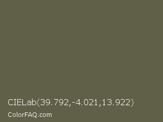 CIELab 39.792,-4.021,13.922 Color is a normal yellow color and the nearest color is Finch #626649. Hex code #605f47 and RGB value is rgb(96,95,71). In RGB color space, this color is composed of 38% red, 37% green, 28% blue, In CMYK color space, this color is composed of 0% cyan, 1% magenta, 26% yellow , 62% black , In HSL color space, this color has a hue angle of 58° , 15% saturation and 33% lightness.