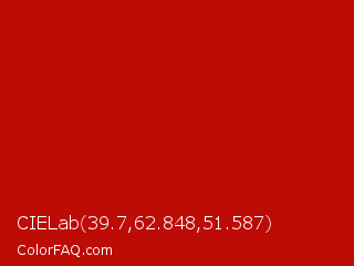 CIELab 39.7,62.848,51.587 Color is a normal red color and the nearest color is Milano Red #b81104. Hex code #bd0b06 and RGB value is rgb(189,11,6). In RGB color space, this color is composed of 74% red, 4% green, 2% blue, In CMYK color space, this color is composed of 0% cyan, 94% magenta, 97% yellow , 26% black , In HSL color space, this color has a hue angle of 2° , 94% saturation and 38% lightness.