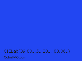 CIELab 39.801,51.201,-88.061 Color is a normal blue color and the nearest color is Palatinate Blue #273be2. Hex code #2246f2 and RGB value is rgb(34,70,242). In RGB color space, this color is composed of 13% red, 27% green, 95% blue, In CMYK color space, this color is composed of 86% cyan, 71% magenta, 0% yellow , 5% black , In HSL color space, this color has a hue angle of 230° , 89% saturation and 54% lightness.