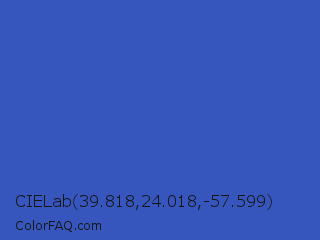 CIELab 39.818,24.018,-57.599 Color is a normal blue color and the nearest color is Cerulean Blue #2a52be. Hex code #3756bd and RGB value is rgb(55,86,189). In RGB color space, this color is composed of 22% red, 34% green, 74% blue, In CMYK color space, this color is composed of 71% cyan, 54% magenta, 0% yellow , 26% black , In HSL color space, this color has a hue angle of 226° , 55% saturation and 48% lightness.