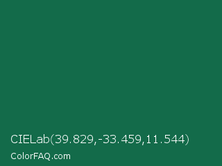 CIELab 39.829,-33.459,11.544 Color is a dark green color and the nearest color is Dark Spring Green #177245. Hex code #136b4a and RGB value is rgb(19,107,74). In RGB color space, this color is composed of 7% red, 42% green, 29% blue, In CMYK color space, this color is composed of 82% cyan, 0% magenta, 31% yellow , 58% black , In HSL color space, this color has a hue angle of 158° , 70% saturation and 25% lightness.
