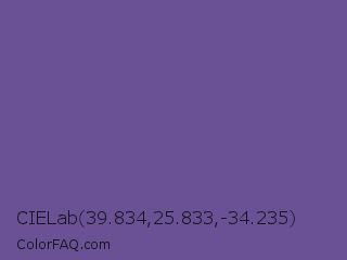 CIELab 39.834,25.833,-34.235 Color is a normal violet color and the nearest color is Dark Lavender #734f96. Hex code #6a5196 and RGB value is rgb(106,81,150). In RGB color space, this color is composed of 42% red, 32% green, 59% blue, In CMYK color space, this color is composed of 29% cyan, 46% magenta, 0% yellow , 41% black , In HSL color space, this color has a hue angle of 262° , 30% saturation and 45% lightness.