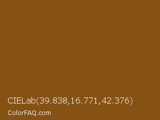 CIELab 39.838,16.771,42.376 Color is a dark orange color and the nearest color is Grizzly #885818. Hex code #865214 and RGB value is rgb(134,82,20). In RGB color space, this color is composed of 53% red, 32% green, 8% blue, In CMYK color space, this color is composed of 0% cyan, 39% magenta, 85% yellow , 47% black , In HSL color space, this color has a hue angle of 33° , 74% saturation and 30% lightness.