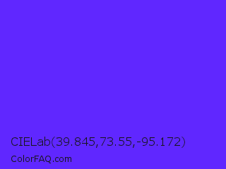 CIELab 39.845,73.55,-95.172 Color is a normal indigo color and the nearest color is Han Purple #5218fa. Hex code #6027ff and RGB value is rgb(96,39,255). In RGB color space, this color is composed of 38% red, 15% green, 100% blue, In CMYK color space, this color is composed of 62% cyan, 85% magenta, 0% yellow , 0% black , In HSL color space, this color has a hue angle of 256° , 100% saturation and 58% lightness.
