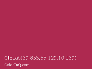 CIELab 39.855,55.129,10.139 Color is a normal rose color and the nearest color is Amaranth Purple #ab274f. Hex code #ae2950 and RGB value is rgb(174,41,80). In RGB color space, this color is composed of 68% red, 16% green, 31% blue, In CMYK color space, this color is composed of 0% cyan, 76% magenta, 54% yellow , 32% black , In HSL color space, this color has a hue angle of 342° , 62% saturation and 42% lightness.