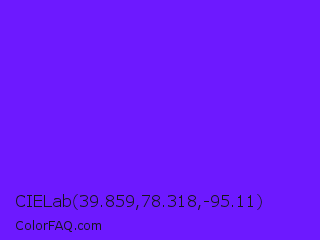 CIELab 39.859,78.318,-95.11 Color is a normal violet color and the nearest color is Electric Indigo #6f00ff. Hex code #6d19ff and RGB value is rgb(109,25,255). In RGB color space, this color is composed of 43% red, 10% green, 100% blue, In CMYK color space, this color is composed of 57% cyan, 90% magenta, 0% yellow , 0% black , In HSL color space, this color has a hue angle of 262° , 100% saturation and 55% lightness.
