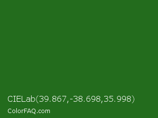 CIELab 39.867,-38.698,35.998 Color is a dark green color and the nearest color is Bilbao #327c14. Hex code #236c1d and RGB value is rgb(35,108,29). In RGB color space, this color is composed of 14% red, 42% green, 11% blue, In CMYK color space, this color is composed of 68% cyan, 0% magenta, 73% yellow , 58% black , In HSL color space, this color has a hue angle of 115° , 58% saturation and 27% lightness.