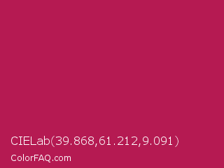 CIELab 39.868,61.212,9.091 Color is a normal rose color and the nearest color is Rose Red #c21e56. Hex code #b51a52 and RGB value is rgb(181,26,82). In RGB color space, this color is composed of 71% red, 10% green, 32% blue, In CMYK color space, this color is composed of 0% cyan, 86% magenta, 55% yellow , 29% black , In HSL color space, this color has a hue angle of 338° , 75% saturation and 41% lightness.