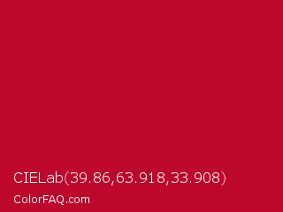 CIELab 39.86,63.918,33.908 Color is a normal red color and the nearest color is Crimson Glory #be0032. Hex code #bd082b and RGB value is rgb(189,8,43). In RGB color space, this color is composed of 74% red, 3% green, 17% blue, In CMYK color space, this color is composed of 0% cyan, 96% magenta, 77% yellow , 26% black , In HSL color space, this color has a hue angle of 348° , 92% saturation and 39% lightness.