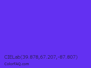 CIELab 39.878,67.207,-87.807 Color is a normal indigo color and the nearest color is Han Purple #5218fa. Hex code #6330f2 and RGB value is rgb(99,48,242). In RGB color space, this color is composed of 39% red, 19% green, 95% blue, In CMYK color space, this color is composed of 59% cyan, 80% magenta, 0% yellow , 5% black , In HSL color space, this color has a hue angle of 256° , 88% saturation and 57% lightness.