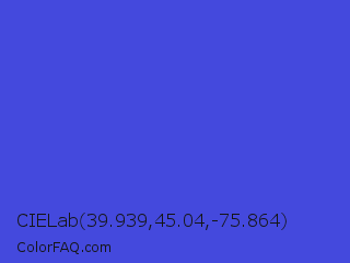 CIELab 39.939,45.04,-75.864 Color is a normal blue color and the nearest color is Iris #5a4fcf. Hex code #4449dd and RGB value is rgb(68,73,221). In RGB color space, this color is composed of 27% red, 29% green, 87% blue, In CMYK color space, this color is composed of 69% cyan, 67% magenta, 0% yellow , 13% black , In HSL color space, this color has a hue angle of 238° , 69% saturation and 57% lightness.