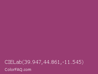 CIELab 39.947,44.861,-11.545 Color is a normal magenta color and the nearest color is Rouge #a23b6c. Hex code #993c72 and RGB value is rgb(153,60,114). In RGB color space, this color is composed of 60% red, 24% green, 45% blue, In CMYK color space, this color is composed of 0% cyan, 61% magenta, 25% yellow , 40% black , In HSL color space, this color has a hue angle of 325° , 44% saturation and 42% lightness.