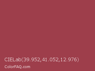 CIELab 39.952,41.052,12.976 Color is a normal red color and the nearest color is Copper Rust #944747. Hex code #9e3e4b and RGB value is rgb(158,62,75). In RGB color space, this color is composed of 62% red, 24% green, 29% blue, In CMYK color space, this color is composed of 0% cyan, 61% magenta, 53% yellow , 38% black , In HSL color space, this color has a hue angle of 352° , 44% saturation and 43% lightness.