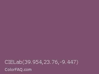 CIELab 39.954,23.76,-9.447 Color is a normal magenta color and the nearest color is Twilight Lavender #8a496b. Hex code #7d506e and RGB value is rgb(125,80,110). In RGB color space, this color is composed of 49% red, 31% green, 43% blue, In CMYK color space, this color is composed of 0% cyan, 36% magenta, 12% yellow , 51% black , In HSL color space, this color has a hue angle of 320° , 22% saturation and 40% lightness.